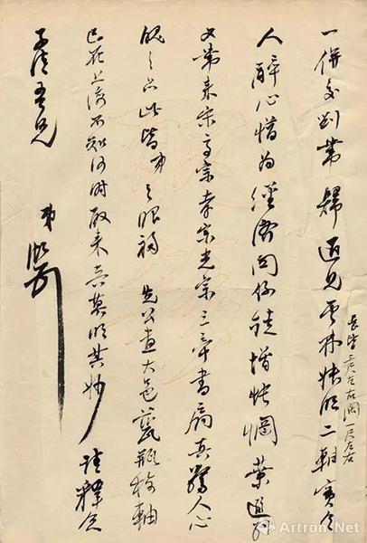 释文:两奉手教敬悉,弟前日在苏,本拟多留数日,适以时局影响,因此地无人主持,不得不遄,因致与吾兄(作长时间之)约谈,未能如愿,心殊歉然。亚伟扇头已画好,交刘定之带上。吟秋对写的殊不惬意,盖为法家前心胆惴惴,腕血震荡所致,且此道弟已久废,不免手生荆棘,及亚伟二联一并交刘带归。近见云林、叔明二轴(长皆三尺左右,阔一尺左右),实令人醉心,惜为经济关系,徒增怅惘。叶遐翁又带来宋高宗、孝宗、光宗三帝书扇,真惊人心魄之品。此皆弟之眼福。先公画大邑瓷瓶梅轴,已在上海,不知何时取来,真莫明其妙。请释念。