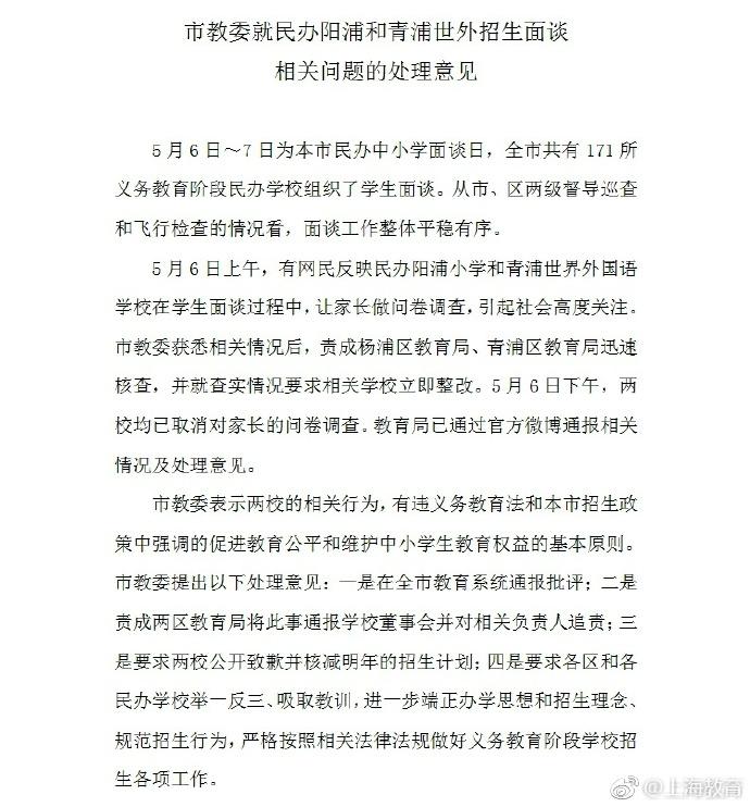 7日下午,上海市教委就两所学校作出处理意见:在全市教育系统通报批评; 责成两区教育局将此事通报学校董事会并对相关负责人追责;要求两校公开致歉并核减明年的招生计划;要求各区和各民办学校严格按照相关法律法规做好义务教育阶段学校招生各项工作。(央视记者吴琼)