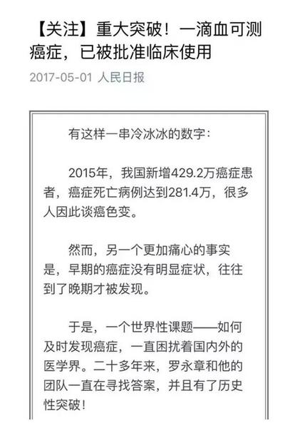 在刚刚过去的五一假期,几家央媒几乎同一时间发布一则消息“重大突破!一滴血可测癌症,已被批准临床使用”。随着“一滴血查癌”不胫而走,罗永章和他的科研团队成为了舆论关注的焦点。