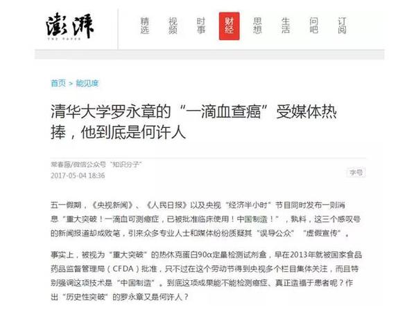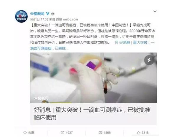 几年过去,“滴血验癌”的新闻再次登上央媒报道,一项复杂的科研突破被通俗地阐释为“一滴血可测癌”。