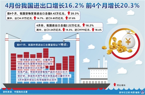 前4个月,我国货物贸易进出口总值8.42万亿元,同比增长20.3%。其中,出口4.57万亿元,增长14.7%;进口3.85万亿元,增长27.8%;贸易顺差7150亿元,收窄26.2%。
