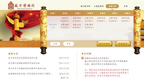 据媒体报道,故宫从2011年9月就开始实行“网络购票”。游客们可登录故宫官网网站,查询“故宫博物院门票预售系统”,上面显示可预先购票期限内每天的“剩余人数”,注册成功后,按照规划的出行时间,根据提示操作即可,十分方便,在预售门票未使用的情况下,还能在规定时间内申请退款和改签。