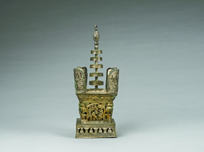 这件阿育王塔高约36厘米,底座边长约12厘米,由基座、塔身、塔顶三部分构成?;旅嬗梅叫我宸饣?,塔座的每侧以菩提树、禅定小佛像4尊相间作装饰。