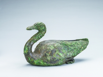 此次一件青铜雁到访首博,由于长时间潮湿环境的侵蚀,水禽周身锈蚀严重。“出土时青铜水禽都不同程度地保存有白色彩绘,可见,当时青铜水禽制作完成时,表面也施有彩绘?!弊宜担骸八嬖峥永镉腥嗽斓暮恿鳎庑┏鐾恋那嗤莼蛘净蛄?,头部均朝向象征性的河道中央?!?/p>