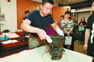 “慢点,慢点,慢点?!敝匾氖虑?,策展人戴鹏伦连说了三遍。一名工作人员弯腰,将一件方鼎青铜器捧出囊匣,放在桌子上。