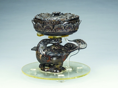配支架,是因为此豆造型奇特:由莲花豆盘、鸟首、鸟身、鸟爪与蛇身分件制成,用榫卯连接和生漆粘接两种方法拼合。其中盘腹较深,口微敛,内壁弧,口沿平直。盘外壁上部一周浮雕十四瓣仰莲花。盘下以一凤鸟为柄,凤头后仰向上,鸟颈弯曲较长,凤冠呈倒式与鸟背相接,鸟嘴张开至极限,鸟嘴里衔住方形榫头,榫头插入盘底榫孔内。凤鸟站立于蛇身之上,鸟身、双翅、鸟尾、鸟腿用整木雕刻。鸟胸脯前倾呈圆弧形,双翅略张与鸟背平,鸟尾呈扇形,双腿并列略呈蹲立之势,两爪平齐抓住一条蜷伏的蛇。蛇身修长,蜷伏成“十”字形,蛇头向后而偏左侧,蛇尾较细长且后飘上翘至鸟尾下部中间呈支撑状,顶住鸟尾,以起支撑作用,这表明楚人在制作器物的过程中已能较好地运用物理学中受力平衡原理?!疤闪?,加上年代久远,已经不再适合受力,所以荆州博物馆特意给文物定制了支架承重?!?/p>