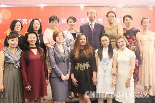 刘显法大使夫妇与肯妇联会会长、理事合影。(中国日报柳洪杰摄)