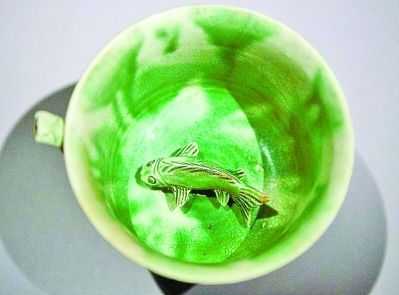 从“黑石号”沉船上打捞起的白釉绿彩鱼底吸杯。资料图片