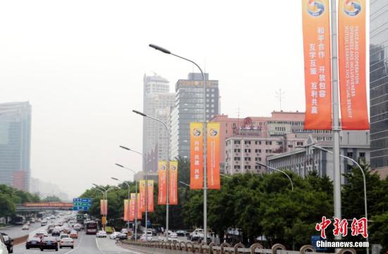 5月8日,北京建国路两侧悬挂宣传道旗,迎接“一带一路”高峰论坛。为迎接5月中旬即将在北京举行的“一带一路”高峰论坛,北京主要道路悬挂宣传道旗、天安门广场及长安街沿线高挂红灯笼、全市布置7座立体花坛。 中新社记者 李慧思 摄