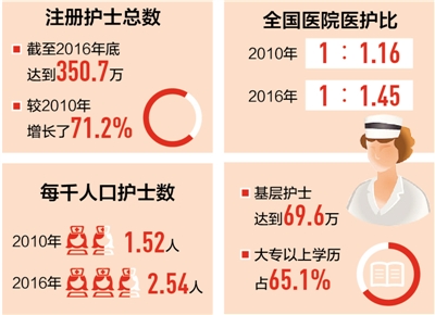 国家卫计委医政医管局副局长郭燕红指出,截至2016年底,我国注册护士总数达到350.7万,占卫生计生专业技术人员的42%,较2010年增长了71.2%,每千人口护士数从2010年的1.52人提高到2016年的2.54人。全国医院医护比由2010年的1∶1.16提高到2016年的1∶1.45。2016年,在基层医疗卫生机构从事护理工作的护士数达到69.6万。具有大专以上学历的护士占总数的65.1%。