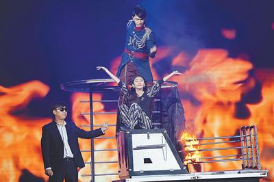 河南省宝丰县第六届魔术文化节,魔术师在表演节目《梦幻之夜》。何五昌摄