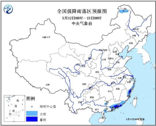 据中央气象台网站消息,中央气象台5月12日06时继续发布暴雨蓝色预警,预计5月12日08时至13日08时,浙江东部、福建东北部和东南部、广西东北部、广东西南部和东南部等地的部分地区有大雨,局地有暴雨(50~70毫米),上述部分地区并伴有短时强降水、雷暴大风或冰雹等强对流天气,小时雨强有20~40毫米,最大可达50毫米以上。