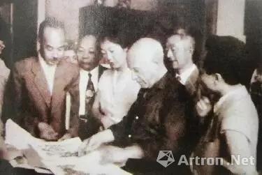 1956年王雪涛参加中国文化代表团访问欧洲,在法国与毕加索相唔,王雪涛(左一)向毕加索介绍赠送齐白石木版水印画集