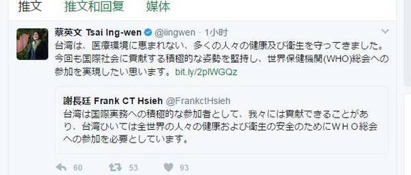 台当局卫生部门昨日(8日)晚间就曾召开记者会,表示将在日内瓦时间截止前继续努力,而如真未获邀请也会派团前往日内瓦表达诉求。此外,为参加WHA,蔡英文8日下午第10度在推特发文,并再度用日文喊话,强调台湾期盼参与WHA,贡献国际社会。这是蔡为了WHA第二次用日文在推特喊话。