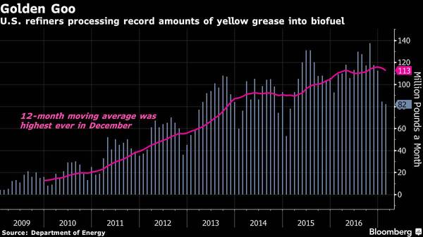美国炼油厂“地沟油”加工量(图片来源:彭博社)