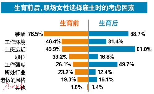 职场妈妈最需要的是什么?“可自由支配的工作时间”以70.5%的得票率位居第一位,“8小时工作时间外,家庭第一位”占有62.1%,位居第二,相对来说,“更高的薪水”(41.1%)、“做自己喜欢做的工作”(40.2%)等需求相对没有那么迫切。