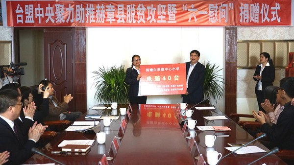 5月9日上午,由中共赫章县委副书记、统战部部长刘军主持捐赠仪式,台盟中央、台盟上海市委、台盟广东省委、台盟湖北省委、台盟云南省委、台盟武汉市委在赫章援建了第二个"同心电教室",向白果镇中心小学捐赠电脑40台;台盟中央向结构乡初级中学捐赠500册图书价值1万元;杨健副主席向赫章一中爱好文学的学生捐赠自己精心撰写的《 邮票上的英国文学》和《邮票上的儿童诗歌》100册图书,并与获赠同学合影留念;台盟北京市委向赫章三小捐赠价值4.5万元电教显示设备和管理软件?;嵘?,赫章县教育局局长刘宗贵介绍了赫章县的教学发展方向,赫章三小校长介绍了台盟中央去年援建 “同心电教室 ”的使用和管理情况,中共赫章县委书记刘建平参加捐赠仪式并致辞。