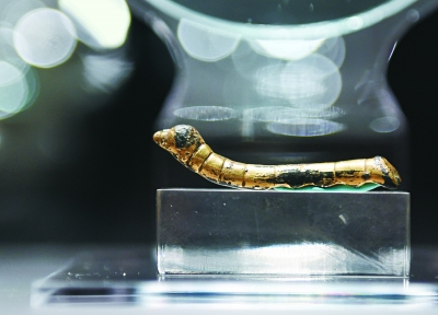 近日,千年“鎏金铜蚕”在北京国家大剧院东展厅展出。这条藏于陕西历史博物馆的“鎏金铜蚕”1984年出土于陕西石泉县,首尾共计9个腹节,体态为仰头或吐丝状,制作精致,造型逼真,此次随“唯寄歌舞寓长安”陕西古代乐舞文物特展在国家大剧院展出。新华社记者 罗晓光摄