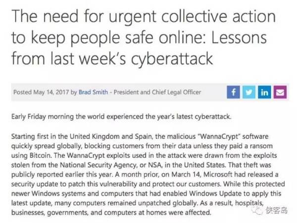 对此,微软总裁Brad Smith也在自己的博客上愤怒地说,“如果这些政府部门继续躲在暗处挖掘全球电脑系统的漏洞,然后制成所谓的’武器库’用来攻击别国或是’买卖’,那么你们就是网络犯罪的帮凶!”