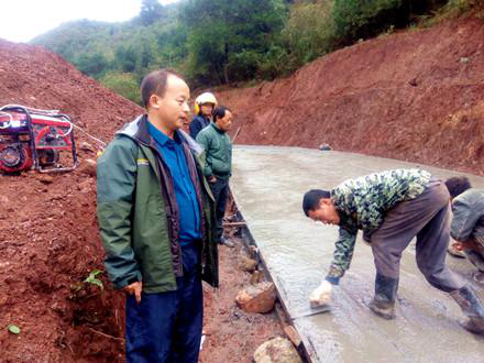 郭庆文(左一)在路面硬化施工现场。 图片来源:贵阳文明网