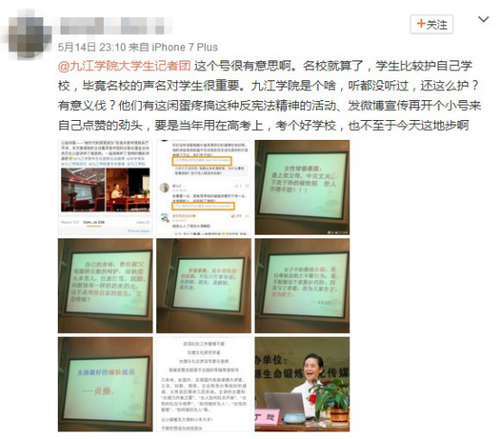 另据观察者网根据网友爆料线索查询,17日一名自称原微博PO主的匿名网友在知乎声明,ppt照片皆为事实,不存在是为了举反例,讲座不允许拍照,爆料图片均为偷拍;不过出于事态发展及自身安全,现已删除原微博。而@九江学院、@九江学院大学生记者团等微博发布的讲座预告、讲座内容也已经无法找到。