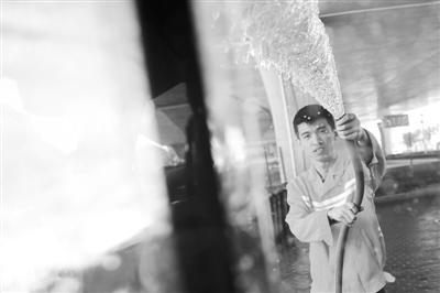 5月10日,青岛市李沧区升平路环卫公司停车场内,臧坚收工后在清洗清扫车辆。 本报记者 黄康 摄