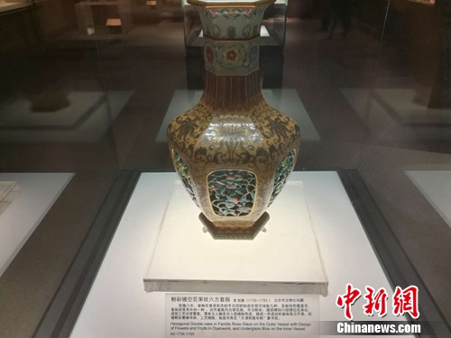 不出意外,记者看到了乾隆时期的“紫地珐琅彩花卉纹瓶”,以及一尊“粉彩镂空花果纹六方套瓶”,不光名字拗口,纹饰、色彩都十分繁复。