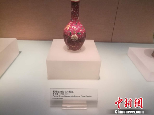 在首博展出的“紫地珐琅彩花卉纹瓶”。上官云 摄