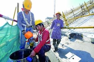 在北京城市副中心行政办公区施工现场,工人们抽空喝一口防暑饮料。