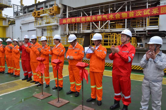 5月18日上午,国土资源部在南海神狐海域举办天然气水合物试采现场会。国土资源部党组书记、部长、国家土地总督察姜大明在现场宣布我国南海神狐海域天然气水合物试采成功,中国地质调查局天然气水合物试采指挥部汇报了水合物试采有关进展。中国石油集团党组书记、董事长王宜林,党组成员、副总经理、中国石油股份公司总裁汪东进出席试采现场会。现场会后,与会领导参观“蓝鲸1号”钻井平台,实地查看试采情况。