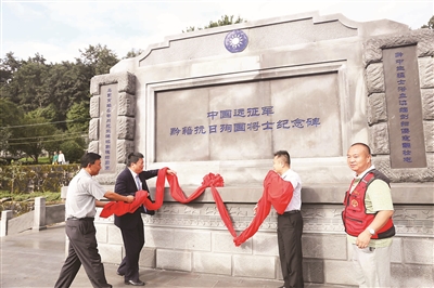 二○一五年九月十四日,由民革贵州省委会倡议并联合关注黔籍抗战老兵志愿者慰问团共同筹资修建的中国远征军黔籍抗日殉国将士纪念碑在云南腾冲顺利竣工。图为在纪念碑落成仪式上,时任民革贵州省委会副主委张树昭(左二)等为纪念碑揭幕。