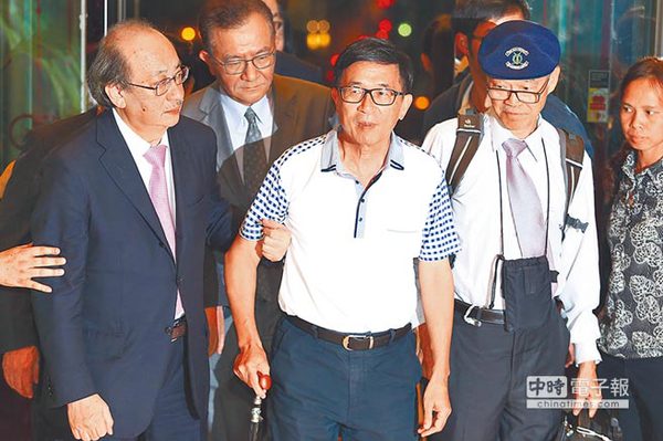 陈水扁早前在柯建铭(左)等人的搀扶下出席募款餐会(图片来源:“中时电子报”)
