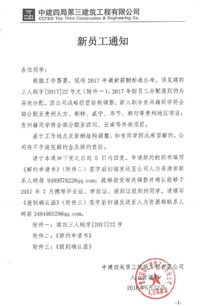 5月12日,临近毕业入职,早已和中建四局三公司签约的大四学生张耀(化名),突然在公司新员工QQ群内收到了一份关于调整薪酬结构和工作地点的通知。