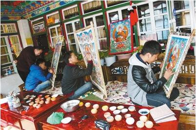 国家级非物质文化遗产项目西藏唐卡(钦孜派)自治区级代表性传承人——扎西(左一)带徒传艺。