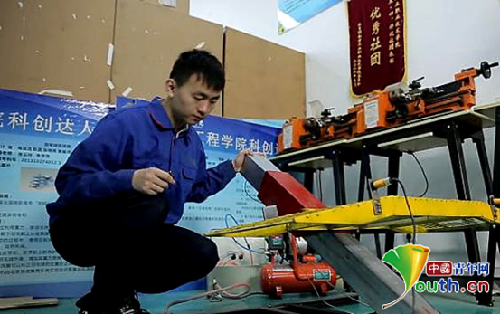 进入大学后,彭飞就加入了机械创新设计协会,但是刚上大一的他在专业知识和技能方面都尚有欠缺,无法完成之前自己设想的合理改善病床的方案,但当他向身边的老师、同学们提及这个想法后,立即得到了大家的肯定和帮助。随后,在社团老师的指导下,在创新经历丰富的学长的帮助下,在热情似火的小伙伴共同努力下,经过一系列的讨论思考、绘图模拟,他们终于设计出一款由单片机控制,可实现转移床空间三维立体转移的更具人性化,更具安全性的转移车。这也是彭飞成功申请的第一份专利——“智能病人转移车”。