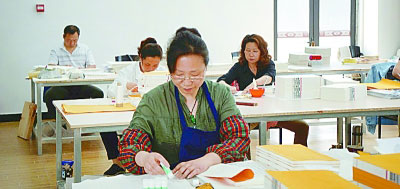 工作人员在装订影印文津阁本《四库全书》。 光明图片