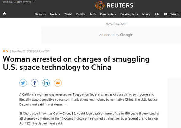 外媒:华裔女子涉嫌“向中国非法提供太空技术”在美被捕
