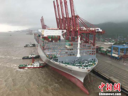 中新网宁波5月24日电(记者 林波)5月24日,新一代全球最大集装箱船“东方香港”轮顺利靠上了宁波舟山港穿山港区集装箱码头。