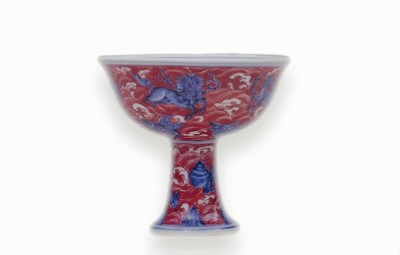 明宣德青花矾红彩海兽图高足杯。