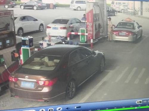 加油站监控视频显示,站内车流量较大,而出口道路上有多辆违停车辆。