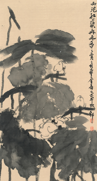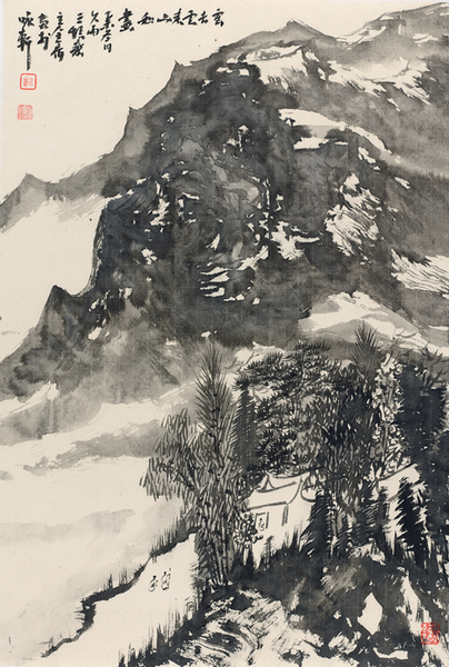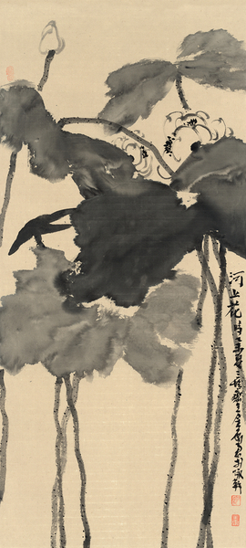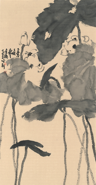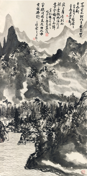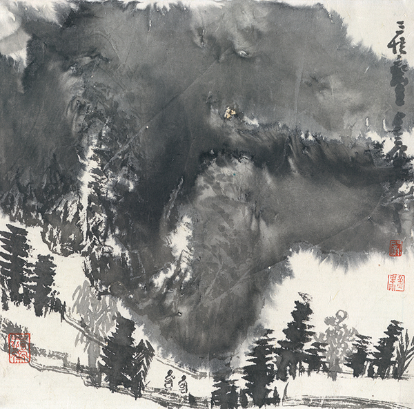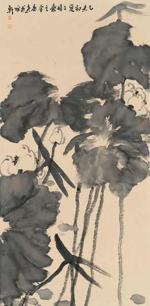 他酷爱墨荷,不惮其烦、一再大笔挥写墨荷,以厚实的用笔根基作底,与把控干湿浓淡火候所必须的“笔断气不断”之功夫相辅相成,其下笔才能浓浓淡淡、分分合合,展现亭亭墨荷之各式神采风致。又时作写意山水,于笔性墨法交融相映中挹其趣,好用泼墨,用笔时笔笔相错、水墨淋漓、厚薄相宜,远山清透飘渺,近处扎实厚重,层次丰富分明。故意经营的小空白随着笔与笔错落所留下,再在最亮的留白处点上最黑的焦墨,不仅可成就更加丰富的层次,还给画面增添灵气和透亮感。这些千变万化的细微笔墨,大大丰富了画面上单纯的艺术语言,可谓平中求奇。