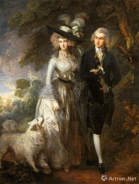 这幅油画描绘了一对年轻夫妇在树林中散步的场景,身旁的白色小狗抬头望向两人。1954年英国国家美术馆以3万英镑买下这幅油画,已保存超过60年。“这幅油画无疑是庚斯博罗最出色的肖像画之一,呈现了他的最高绘画水平,是乔治王时代标志性的一幅肖像画?!?/p>