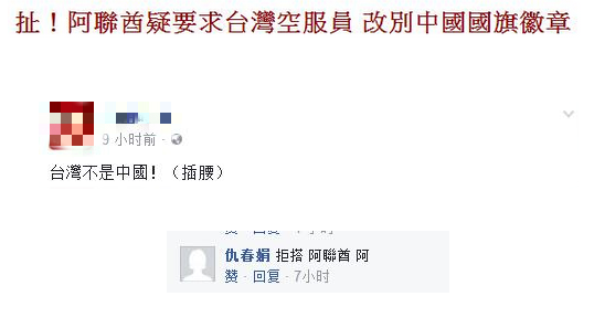 台媒报道称,阿联酋航空公司于30日发函给所有机组成员,表示公司为增开亚洲尤其中国的航班并因应一个中国政策,要求台籍空服人员执勤时,在围裙上移除“青天白日满地红旗”徽章并改配戴中国五星红旗徽章,航班飞中国时,机组员的名单,台籍空服员标注中国籍,且一律写台胞证证号,不准写“中华民国护照”号码。
