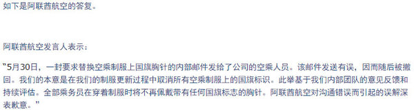 31日,阿联酋航空发言人回复环球时报-环球网记者的邮件中称,“5月30日,一封要求替换空乘制服上‘国旗’胸针的内部邮件发给了公司的空乘人员。该邮件发送有误,因而随后被撤回。我们的本意是在我们的制服更新过程中取消所有空乘制服上的国旗标识。此举基于我们内部团队的意见反馈和持续评估。全部乘务人员在穿着制服时将不再佩戴带有任何国旗标志的胸针。阿联酋航空对沟通错误而引起的误解深表歉意?!?/p>