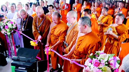 上图为梵智长老、沙威长老、中国佛学院副院长向学大法师、中国佛协教育培训部主任圆慈大法师、大乘佛教研究中心主任本性大法师等为新办公区剪彩。(开元)