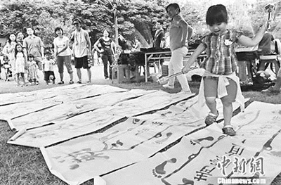 一手短剑、一手鼓槌,循着祈福帆布上的脚印,小学三年级的李安琪开心地跳跃在“身体健康”“五谷丰登”等祝福语之间,体验名为“脚踏七星大乐粽”的活动。