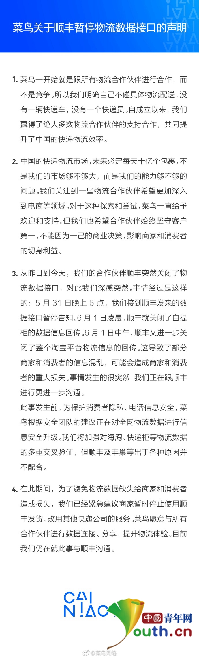中国青年网北京6月2日电(记者 栗鹏菲)6月1日,菜鸟网络公开声明,今日凌晨,顺丰关闭了对菜鸟的自提柜的数据信息回传。截止中午,顺丰又进一步关闭了整个淘宝平台物流信息的回传。菜鸟表示这一系列行为,导致了部分商家和消费者的信息混乱,并有可能造成商家和消费者的重大损失。
