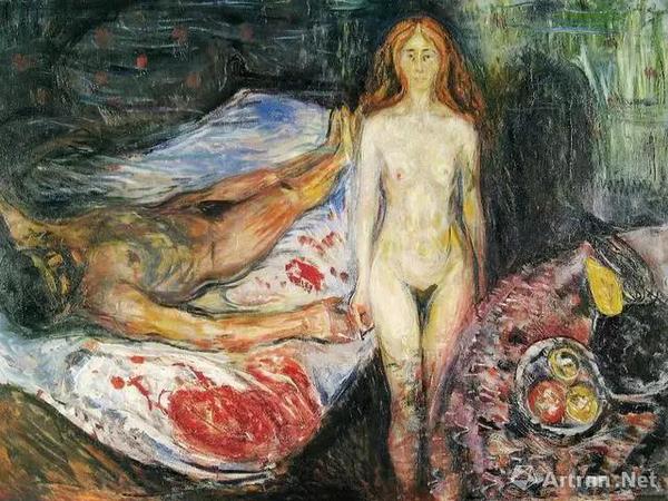 一百多年后,一个叫蒙克的画家也画了同题材作品《马拉之死》,他让受害者和谋杀者同框。