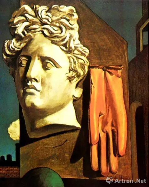 基里科《爱之歌》:超现实主义艺术家基里科把巨大的石膏人像和橡皮手套并置在荒废的城市里,取名《爱之歌》。