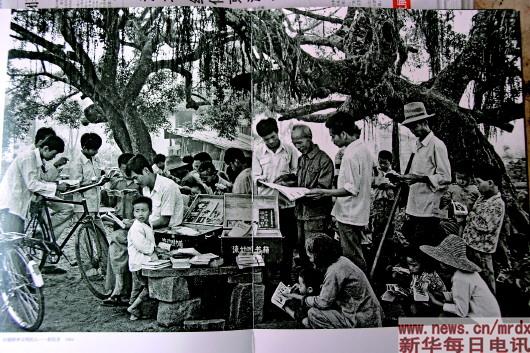 ▲翻拍自《定安记忆》摄影集中的老照片。多年来,孙衍吾坚持骑着一辆破“永久”式带大梁的自行车走村串户给人送书,已成为很多人的“定安记忆”。(4月30日摄) 摄影:本报记者刘邓